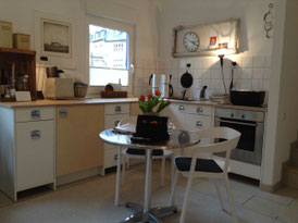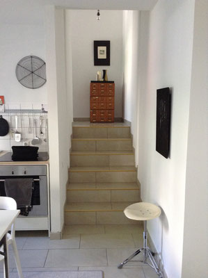 Es umfasst Wohn- und Essbereich (mit offener kompletten Einbauküche), Diele und Duschbad im EG sowie den Arbeits- und Schlafraum in Hochparterre. Die Wohnung auf Zeit ist komplett